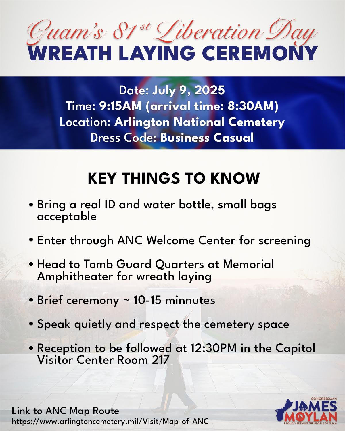 If you are planning to attend this ceremony, escorts coordinated by the Guam Congressional Office will be at the entrance, but you will need to provide the following vehicle information for vehicle access for the event by 9:00 AM, Thursday, July 3, 2025: Make, Model, Year and License Plate. Please send this information directly to Arvin Salonga at Arvin.Salonga@mail.house.gov.